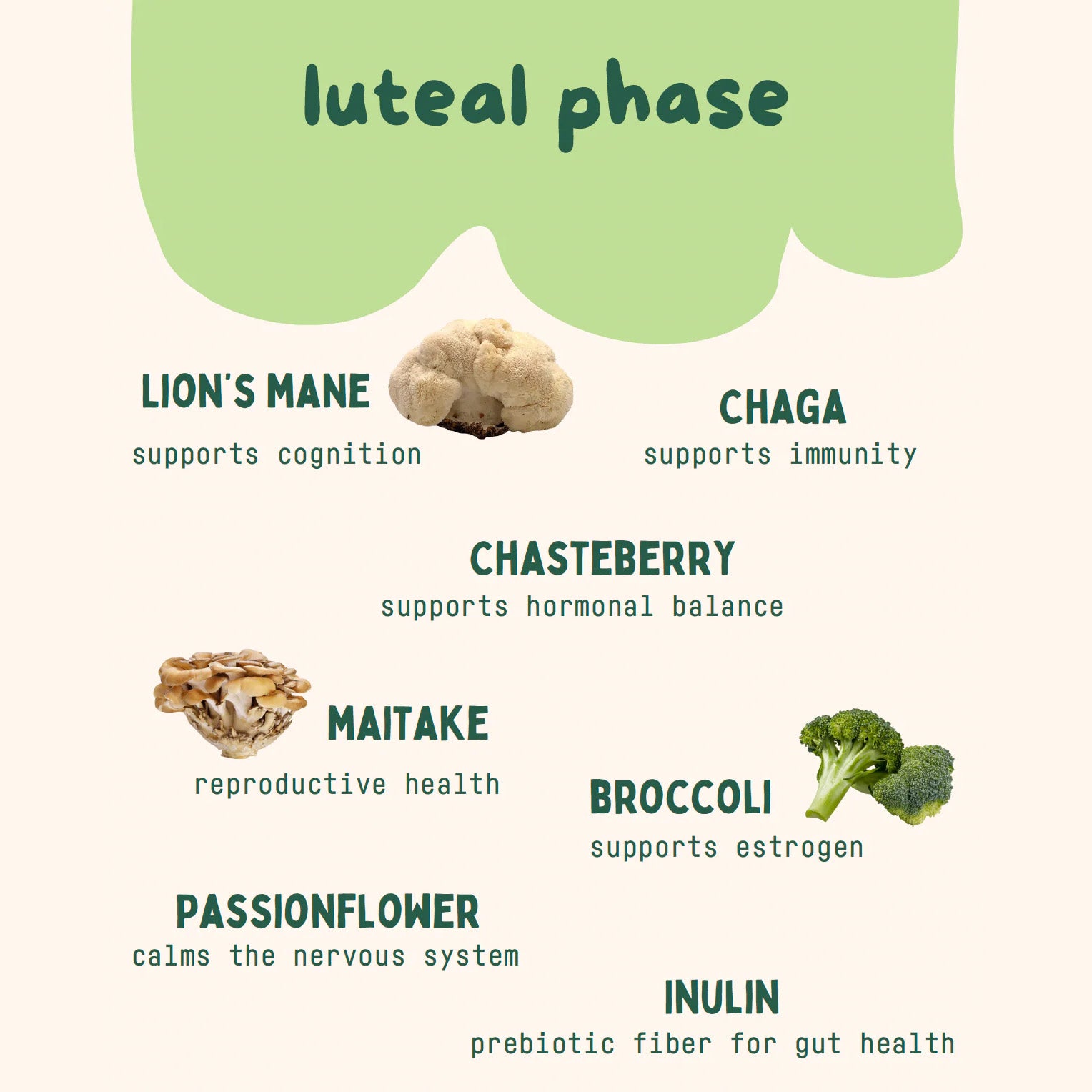 • Support hormonal stability, emotional regulation, and inflammatory balance during the second half of your cycle. Formulated with Chaga, Lion’s Mane, Maitake, Vitex Chasteberry, and Broccoli Extract, Luteal Phase Gummies promote cognitive resilience, progesterone support, and PMS symptom relief. Inulin and Passionflower assist with hormone detox, digestion, and emotional ease as your body prepares for menstruation.
