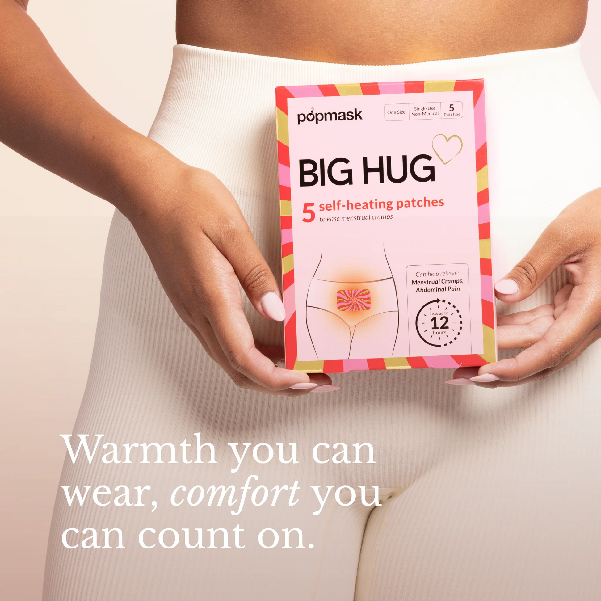 Big Hug Self-Heating Patches deliver 12 hours of steady, soothing heat to naturally relieve menstrual cramps—without medication or bulky heating pads. Activated by air, our patches warm up within 30 seconds to provide flexible, all-day comfort, whether you’re at home, at work, or on the go. Made with biodegradable, skin-safe materials, Big Hug offers a natural, eco-friendly solution for managing period pain discreetly and effectively.
