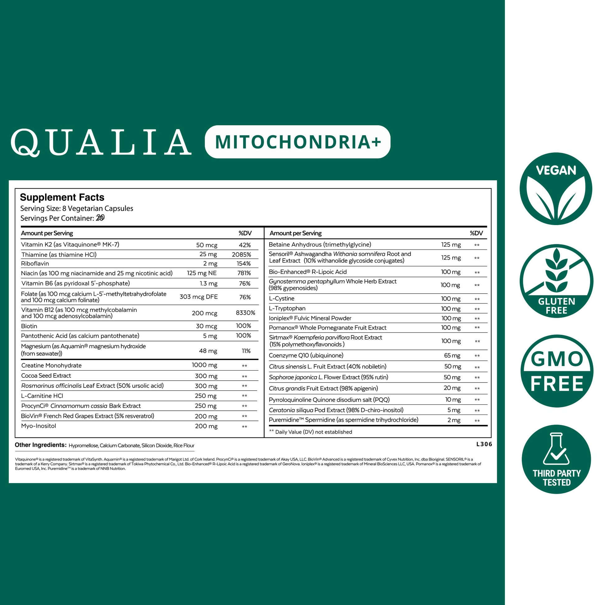 • Qualia Mitochondria+ is a powerhouse blend of 34 premium ingredients that give cells and mitochondria the nutrition they need to work at their best, so you can look, feel, and perform optimally, regardless of age. If you wanted to rejuvenate your body’s ability to perform as it did when you were a young adult at your physical peak, what would need nutritionally supported? That is the question we asked ourselves when formulating Qualia Mitochondria+. This meant comprehensively supporting and enhancing the molecules, processes and pathways involved in health at the cellular level, where aging starts. A central goal was a deep focus on cellular energy generation, because with more cellular energy, general cellular functions perform better, and interacting cells work more effectively together. By formulating at the level of cellular fitness, many of the negative impacts of aging, downstream of poor cellular fitness, can be delayed for decades to come.*